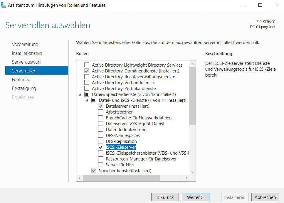 Installation des iSCSI Target Server auf DC-01