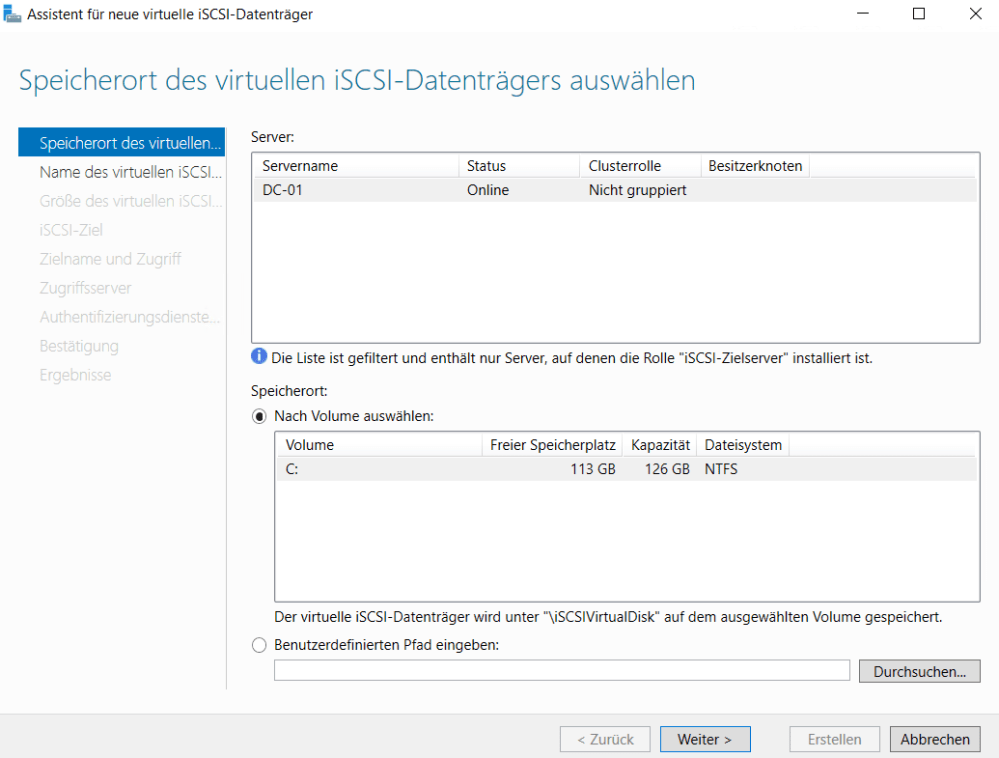 Speicherort der iSCSI Disk wählen. In meinem Fall C:.