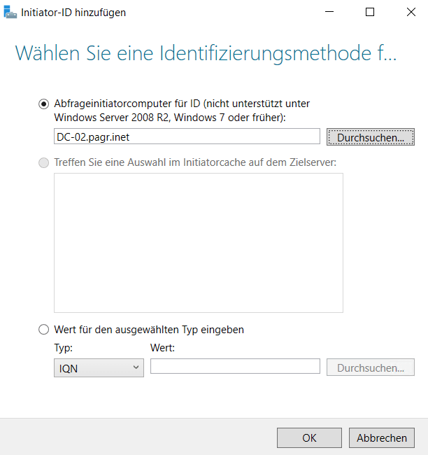 Hier wird der iSCSI Initiator FQDN angegeben, sprich der Computer welcher auf die Disk zugreifen soll.