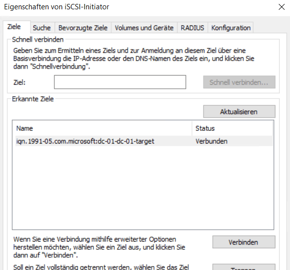 Die Eigenschaften des iSCSI Initiator öffnen sich. Jetzt bei Ziel den FQDN des iSCSI Target Server im Feld Ziel eingeben und auf Schnell verbinden… klicken. In meinem Fall ist das DC-01.