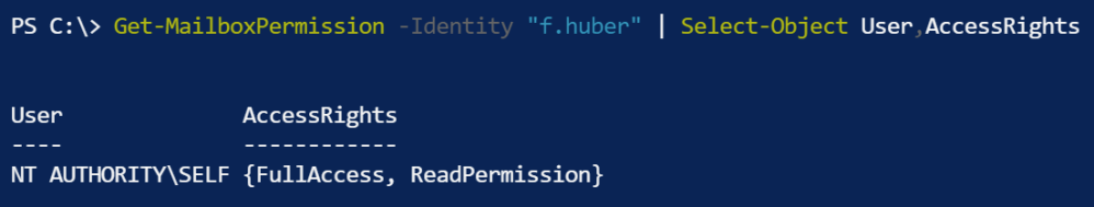 Get-MailboxPermission -Identity "f.huber" | Select-Object User,AccessRights