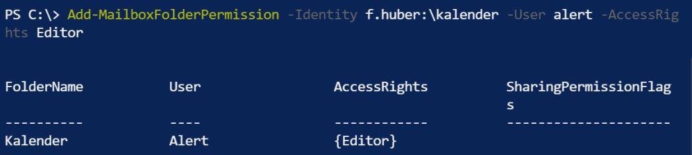 Add-MailboxFolderPermission -Identity f.huber:\kalender -User alert -AccessRights Editor