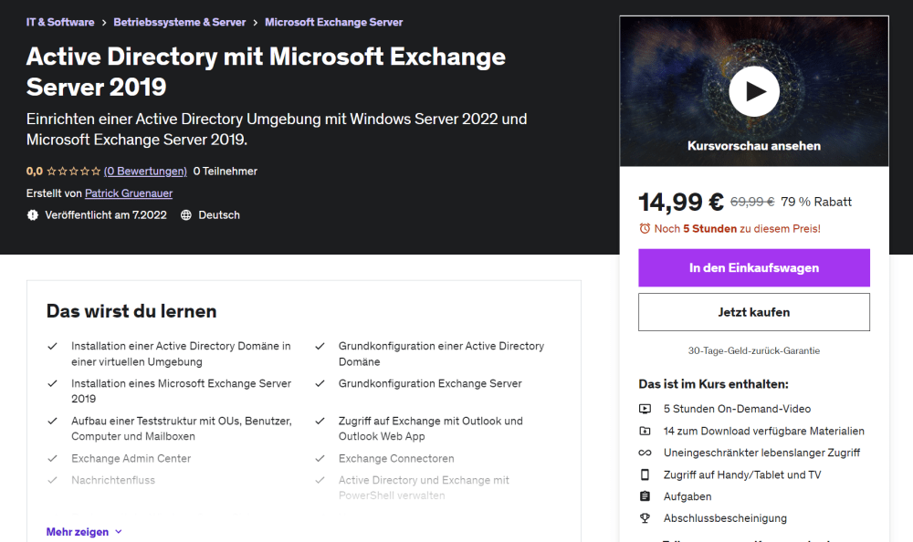 Wenn Du Interesse an Active Directory und Exchange hast, dann kannst Du mit diesem Gutschein-Link meinen neuen Udemy Kurs buchen und diesen 30 Tage lang testen.