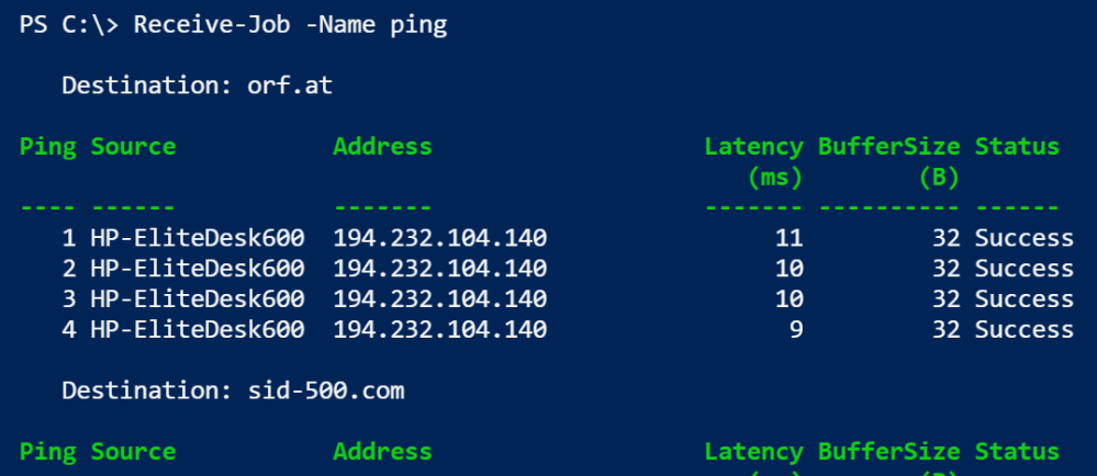 Then I start my background job “ping” to ping all computer names in $namen. Note that I use the $using variable to be able to use $namen, which is a global variable and therefore out of the scope of the script block.