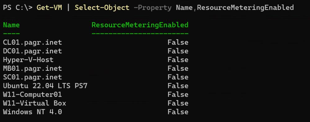 Get-VM | Select-Object -Property Name,ResourceMeteringEnabled