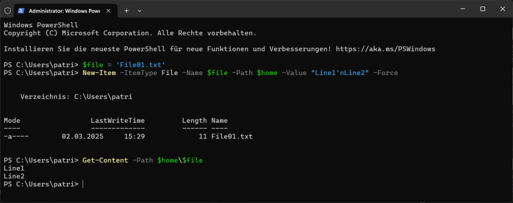 New-Item -ItemType File -Name $file -Path $home -Value "Line1`nLine2" -Force